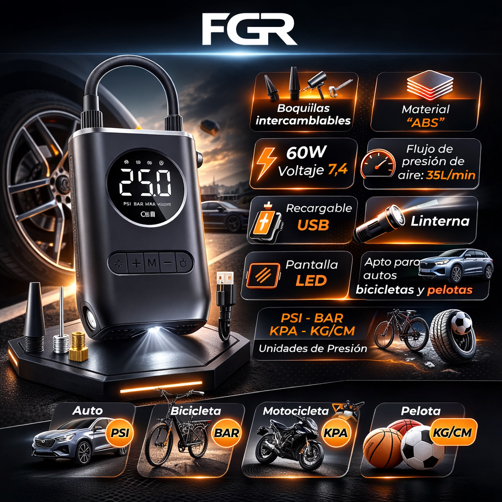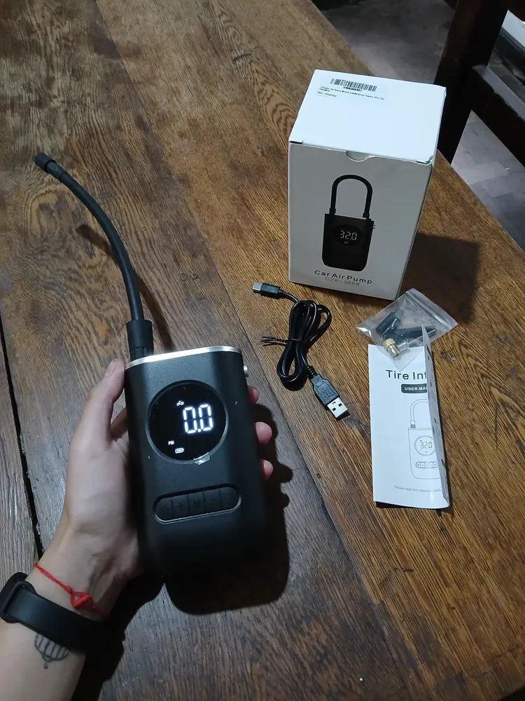 El mini inflador FGR STORE es la solución perfecta para todas tus necesidades de inflado. Con sus potentes 120 PSI, puedes inflar prácticamente cualquier cosa en minutos con solo pulsar un botón.